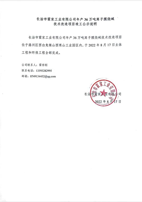 長治市霍家工業(yè)有限公司年產(chǎn)36萬噸離子膜燒堿技術(shù)改造項目竣工公示說明